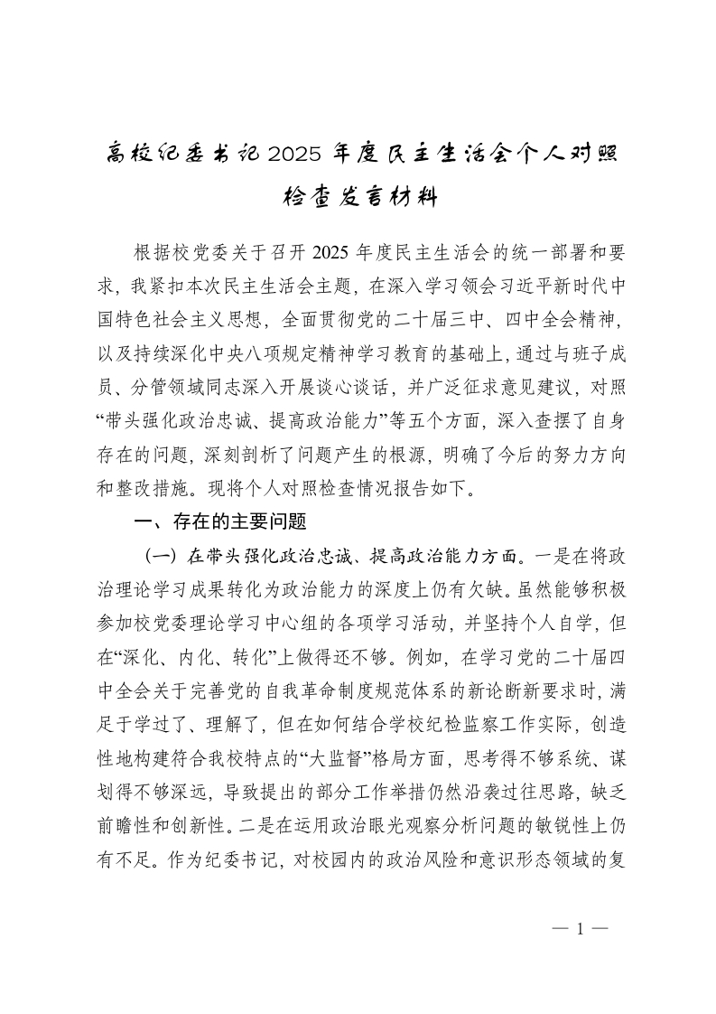 高校纪委书记2025年度民主生活会个人对照检查发言材料