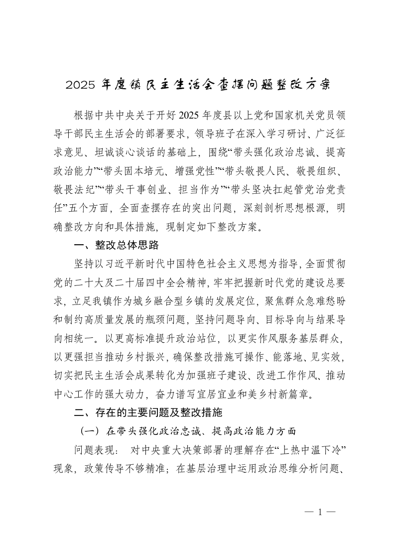 2025年度镇民主生活会查摆问题整改方案