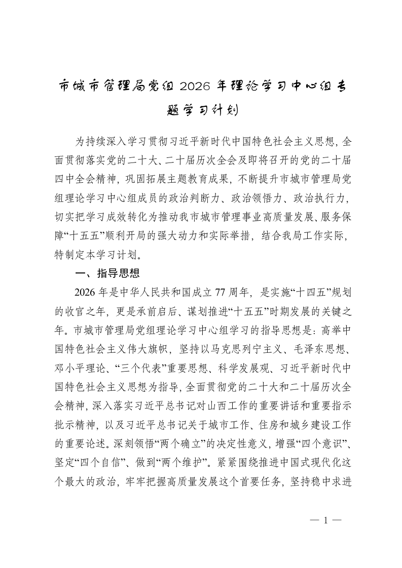市城市管理局党组2026年理论学习中心组专题学习计划