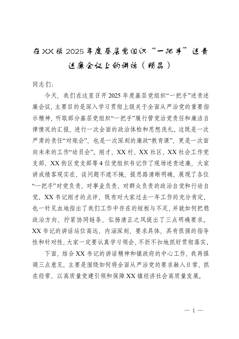 在XX镇2025年度基层党组织“一把手”述责述廉会议上的讲话(精品)