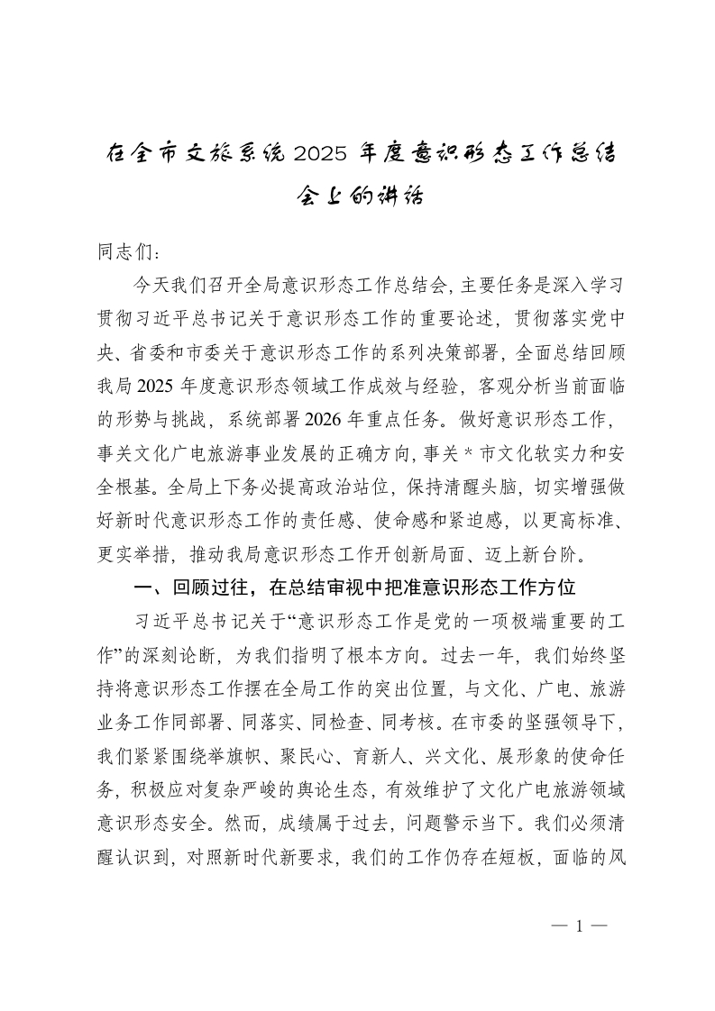 首页公文大全讲话发言在全市文旅系统2025年度意识形态工作总结会上的讲话