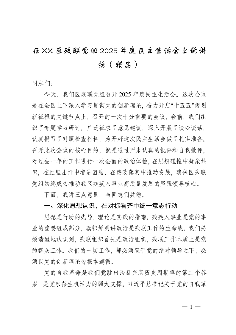 在XX区残联党组2025年度民主生活会上的讲话(精品)
