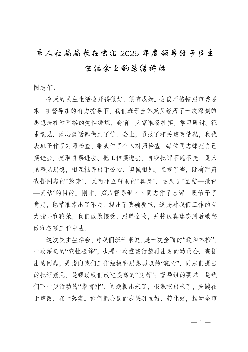 市人社局局长在党组2025年度领导班子民主生活会上的总结讲话