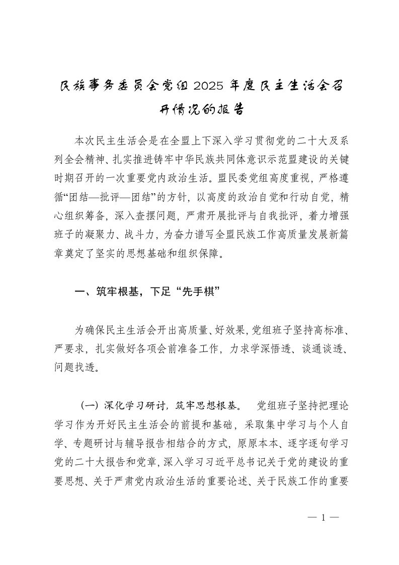 民族事务委员会党组2025年度民主生活会召开情况的报告