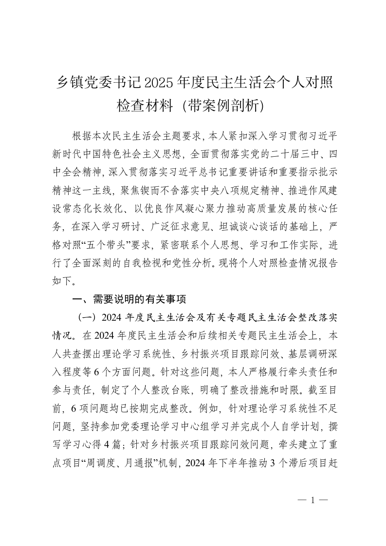 乡镇党委书记2025年度民主生活会个人对照检查材料