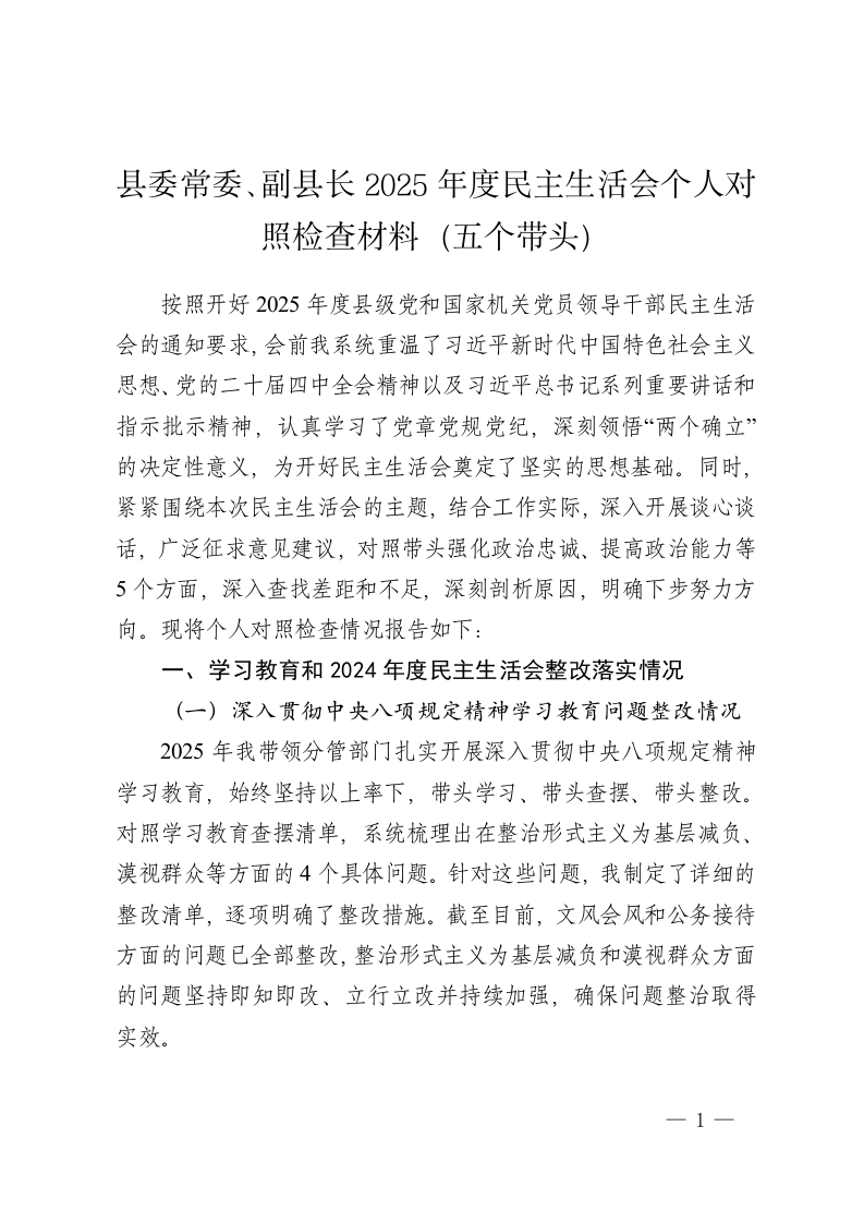 首页公文大全民主生活会县委常委、副县长2025年度民主生活会个人对照检查材料(五个带头)