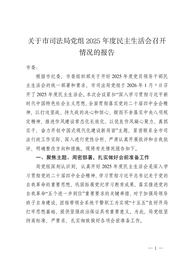 关于市司法局党组2025年度民主生活会召开情况的报告