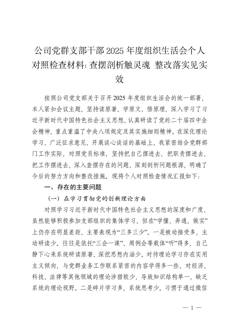 公司党群支部干部2025年度组织生活会个人对照检查材料
