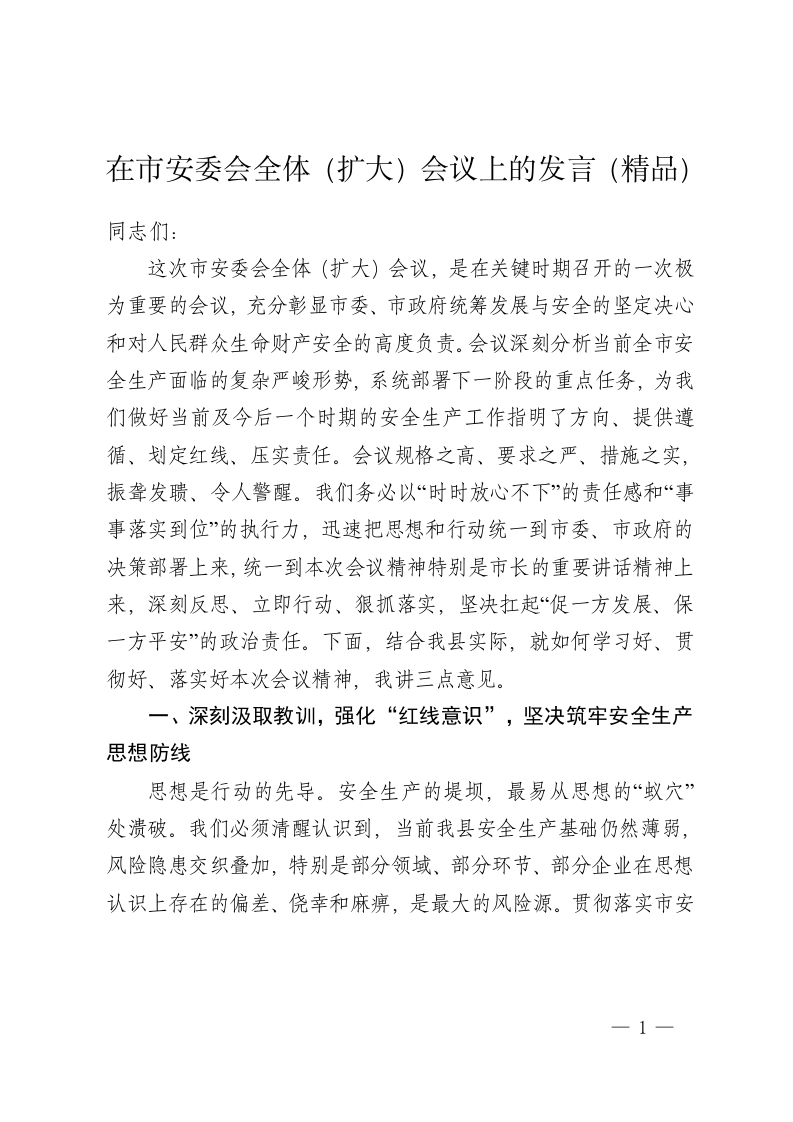 在市安委会全体(扩大)会议上的发言(精品)