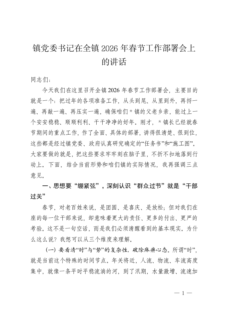 镇党委书记在全镇2026年春节工作部署会上的讲话