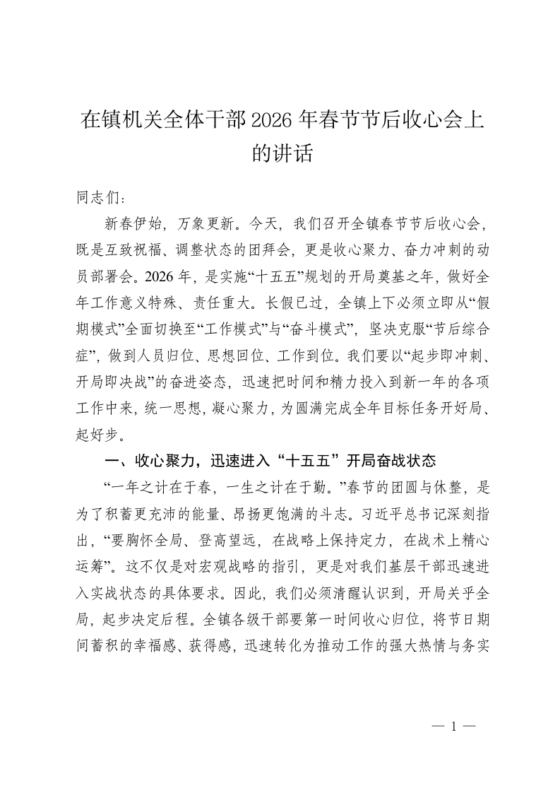 在镇机关全体干部2026年春节节后收心会上的讲话