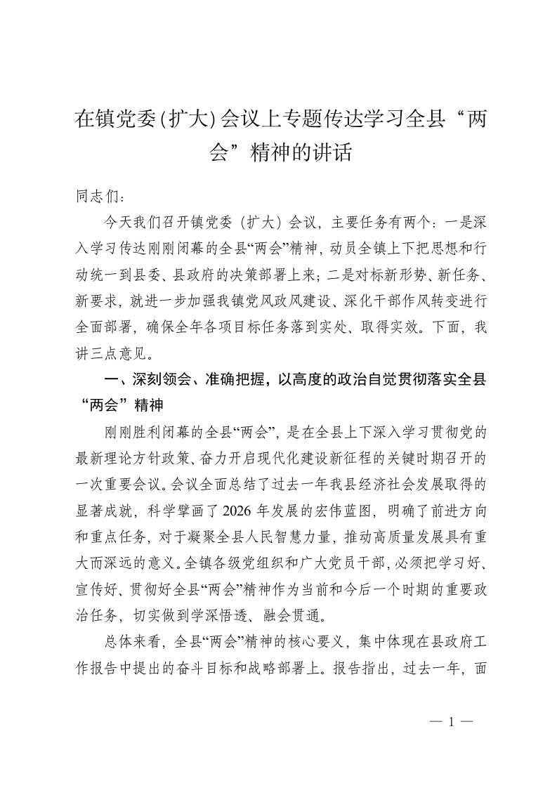 在镇党委(扩大)会议上专题传达学习全县“两会”精神的讲话
