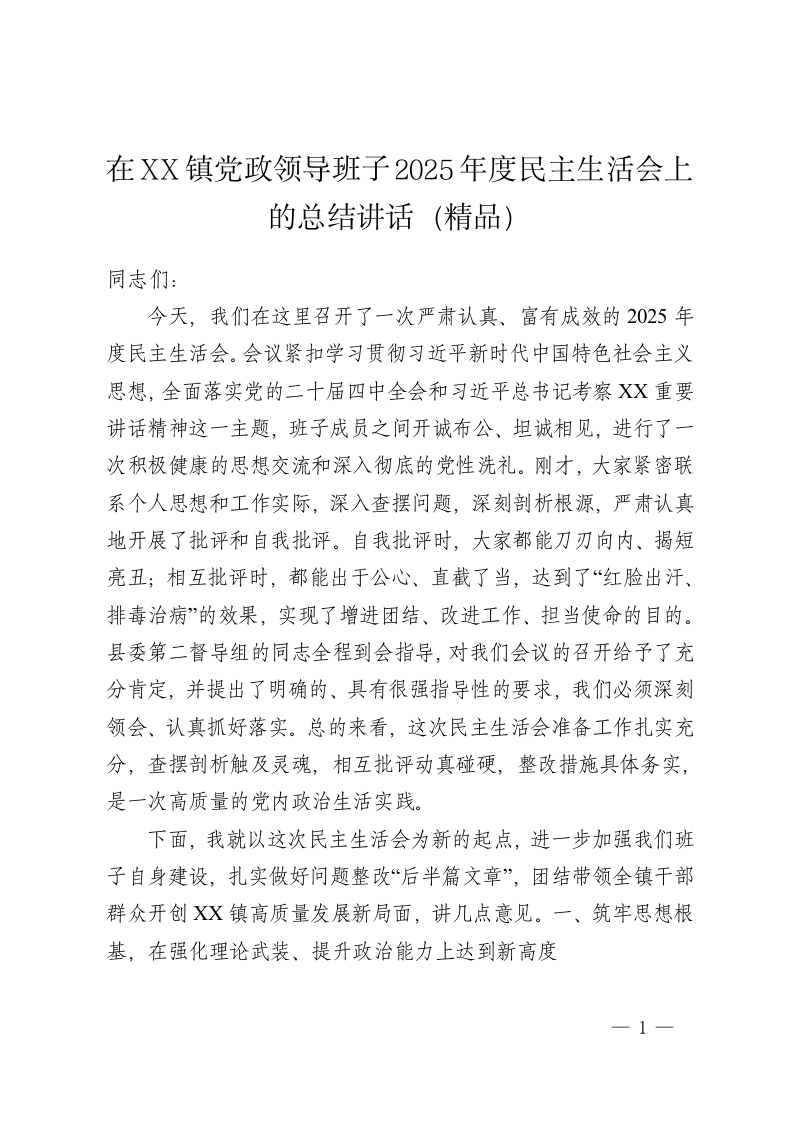 在XX镇党政领导班子2025年度民主生活会上的总结讲话(精品)