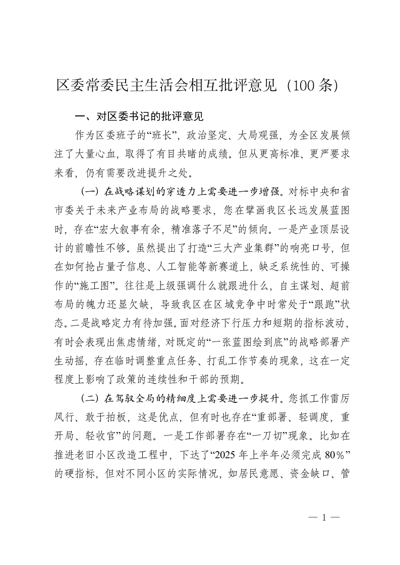 区委常委民主生活会相互批评意见(100条)
