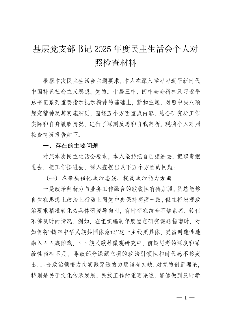 基层党支部书记2025年度民主生活会个人对照检查材料