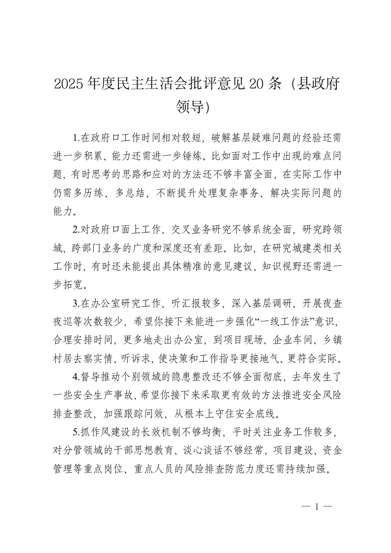 首页公文大全民主生活会2025年度民主生活会批评意见20条(县政府领导)