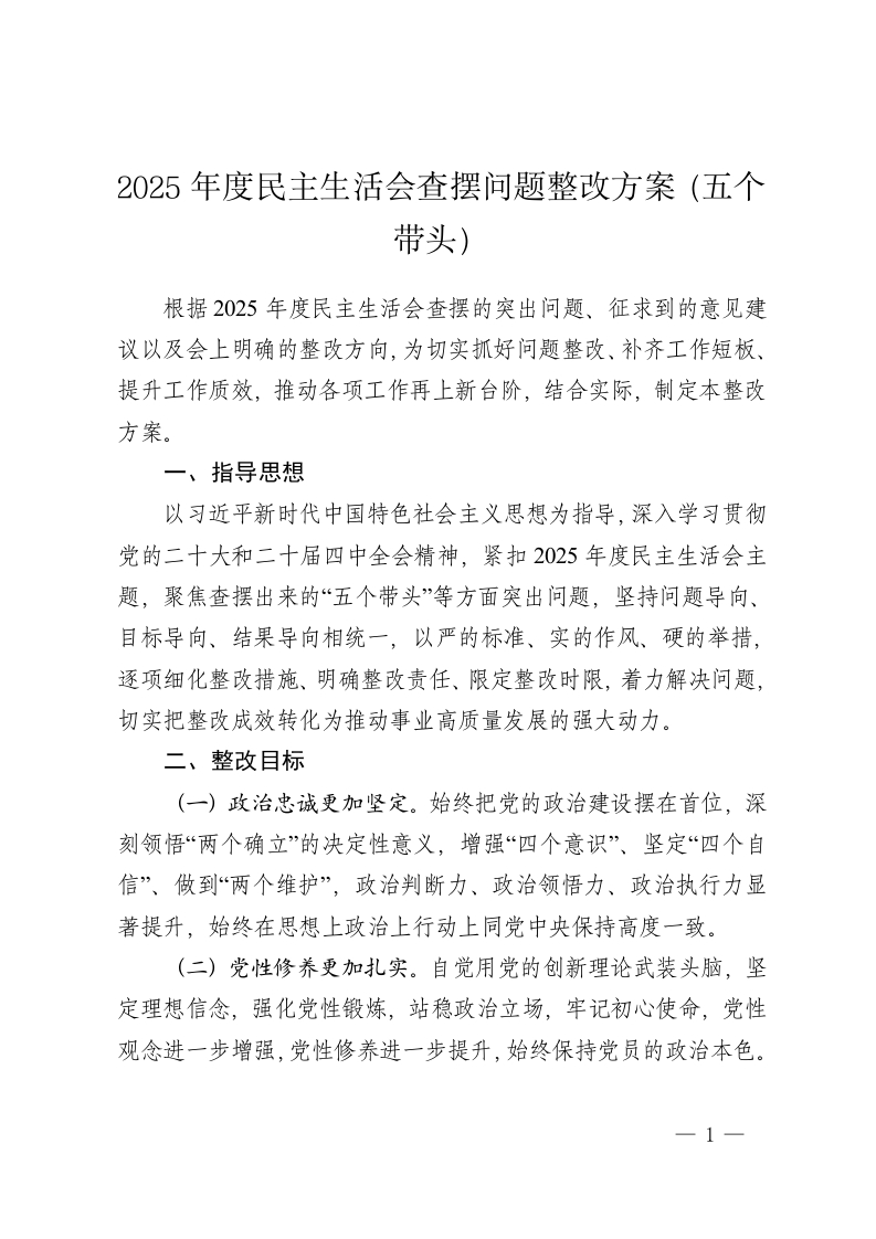2025年度民主生活会查摆问题整改方案(五个带头)