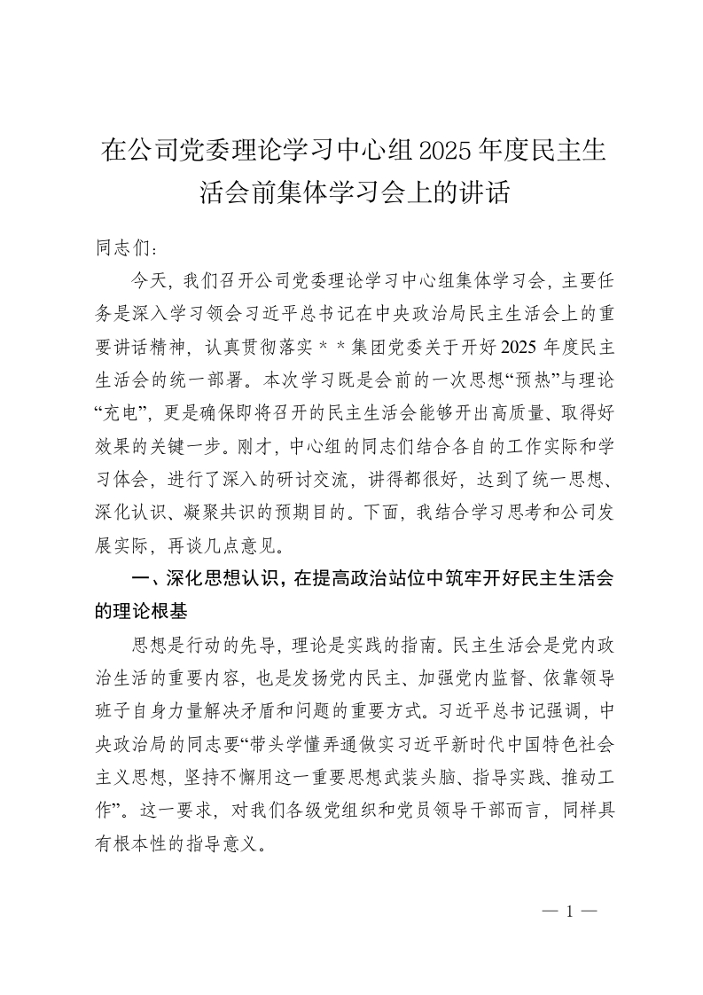 在公司党委理论学习中心组2025年度民主生活会前集体学习会上的讲话