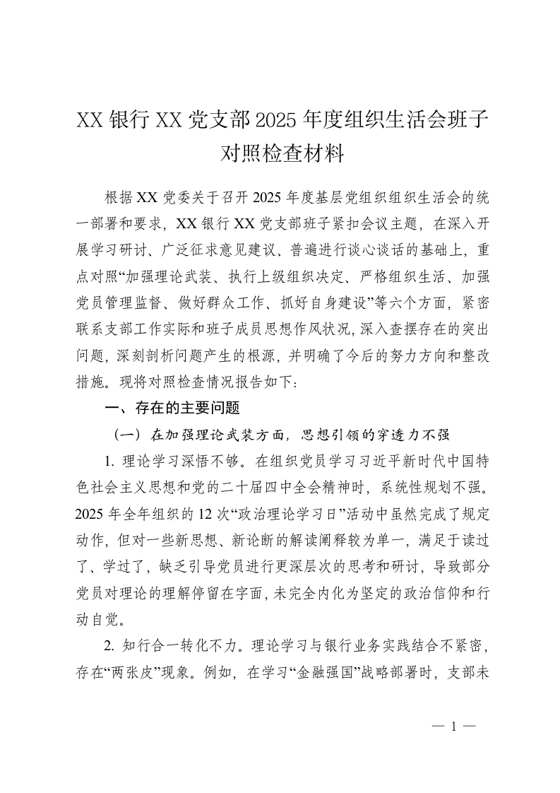 XX银行XX党支部2025年度组织生活会班子对照检查材料