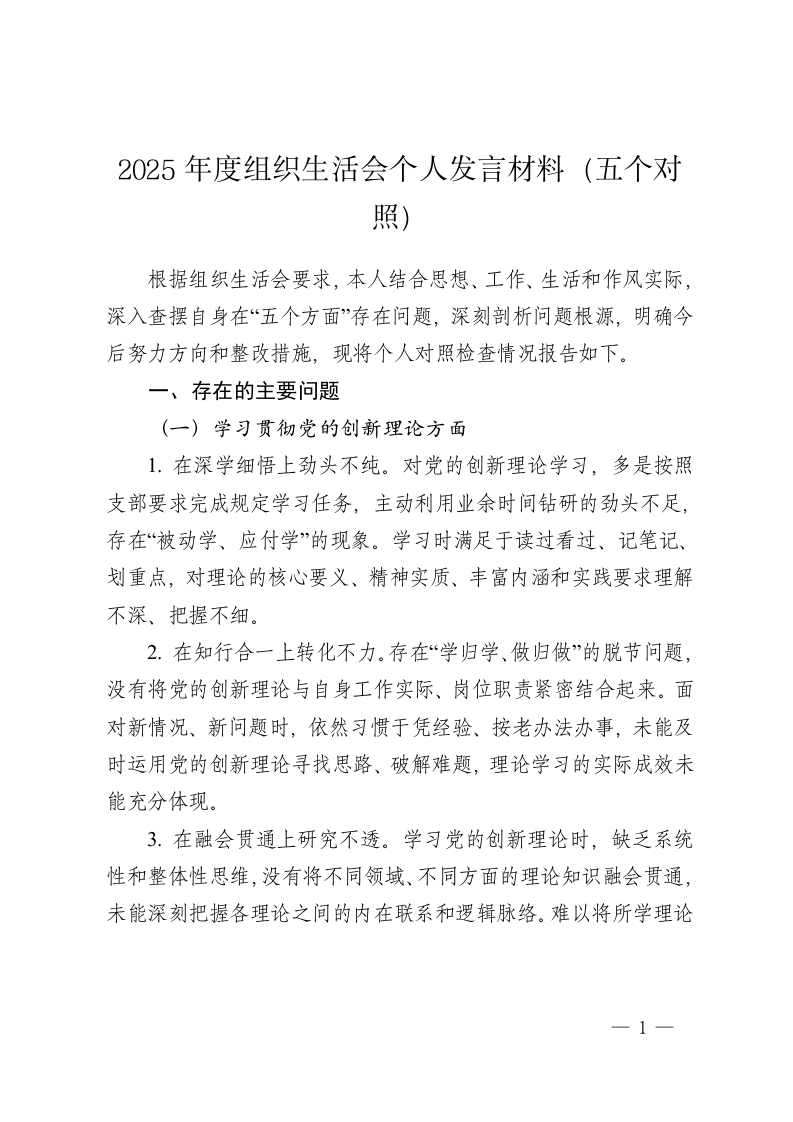 2025年度组织生活会个人发言材料(五个对照)