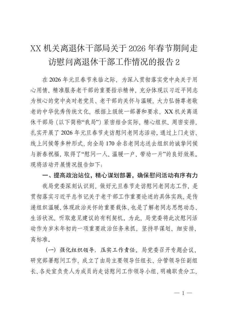XX机关离退休干部局关于2026年春节期间走访慰问离退休干部工作情况的报告2