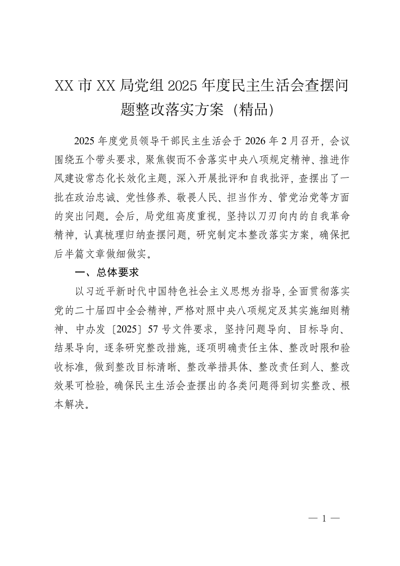 XX市XX局党组2025年度民主生活会查摆问题整改落实方案(精品)