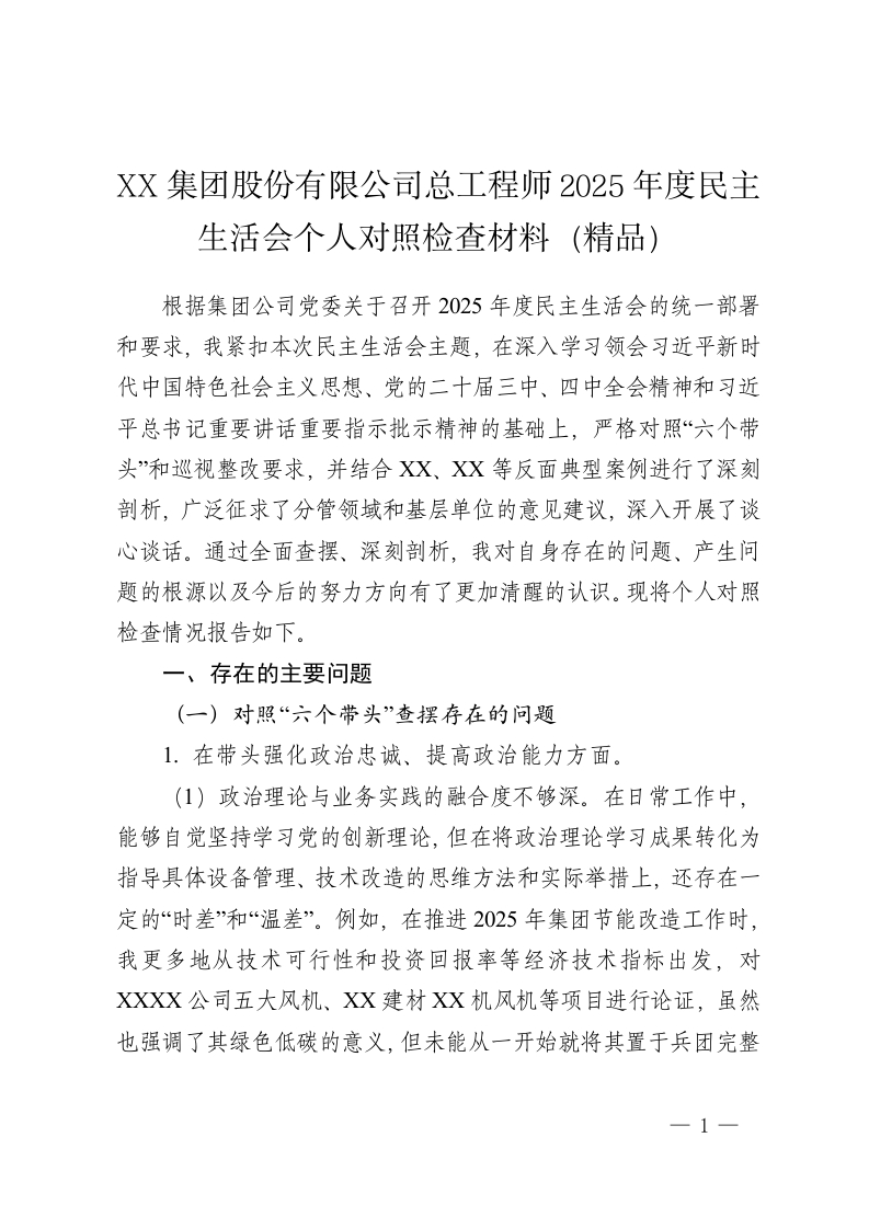 XX集团股份有限公司总工程师2025年度民主生活会个人对照检查材料(精品)