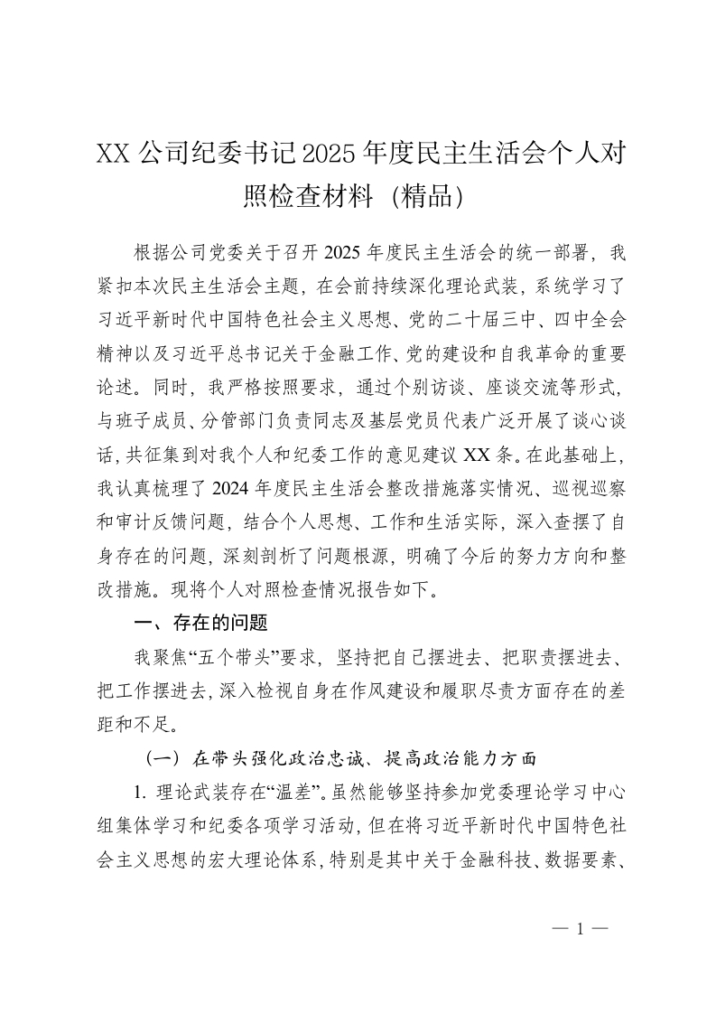 XX公司纪委书记2025年度民主生活会个人对照检查材料(精品)