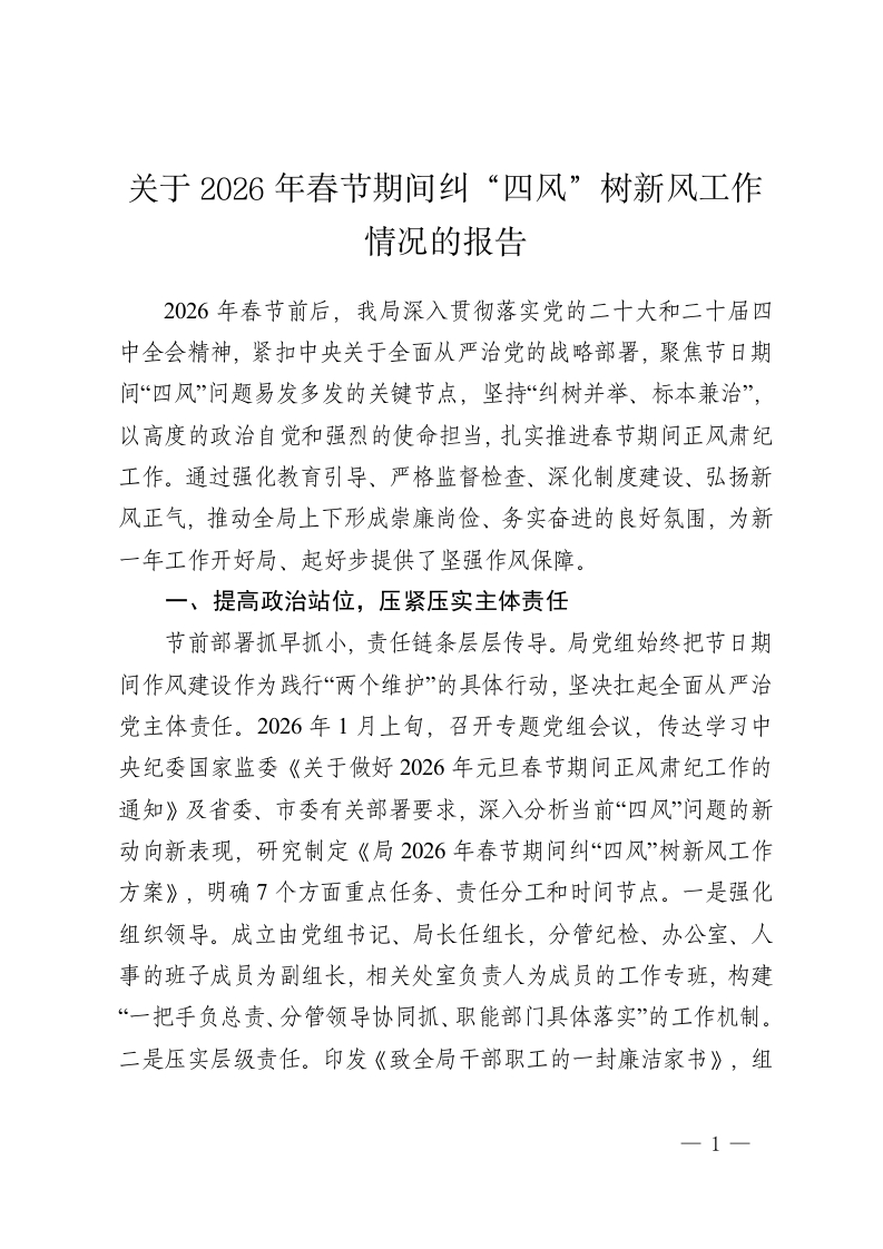 关于2026年春节期间纠“四风”树新风工作情况的报告