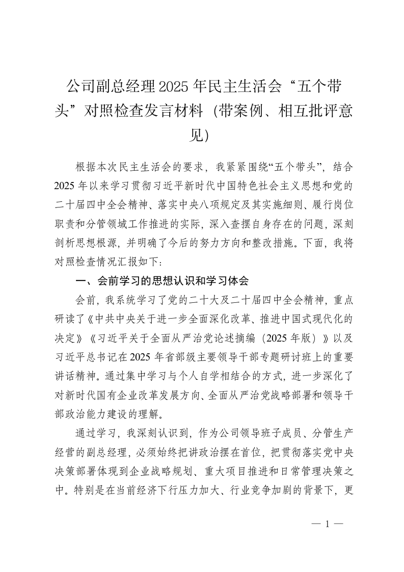 公司副总经理2025年民主生活会“五个带头”对照检查发言材料(带案例、相互批评意见)