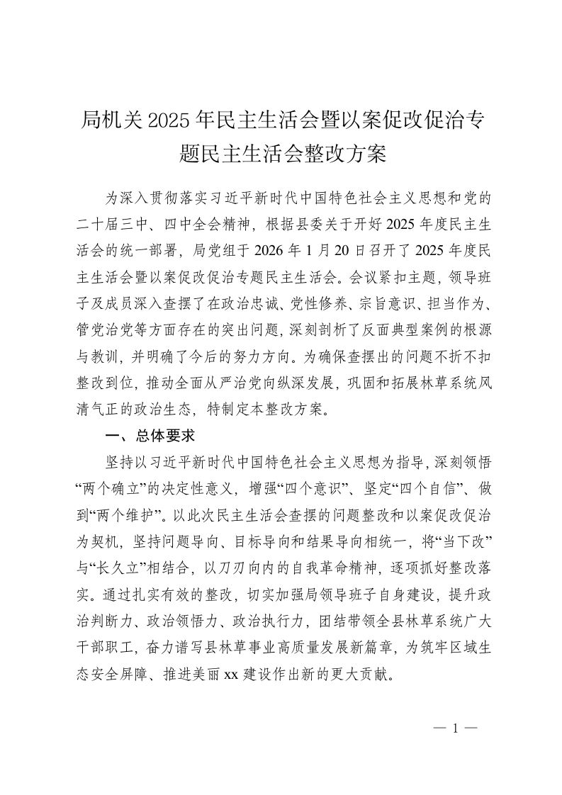 局机关2025年民主生活会暨以案促改促治专题民主生活会整改方案