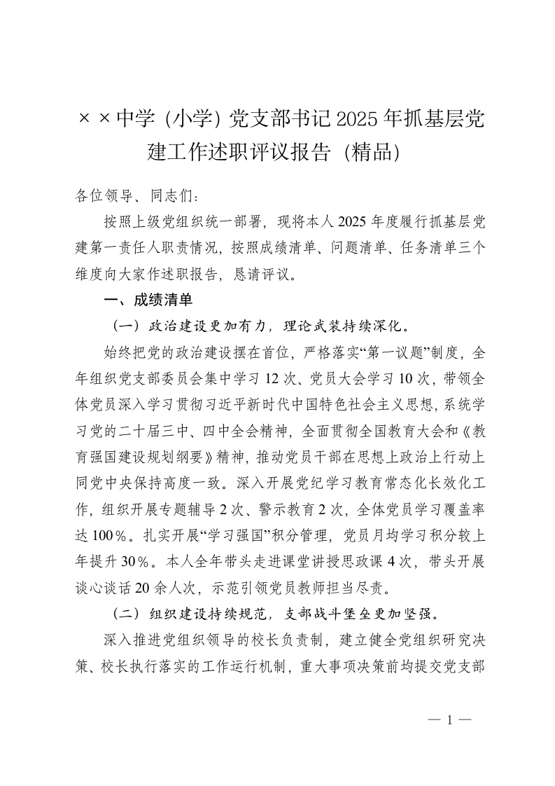 ××中学(小学)党支部书记2025年抓基层党建工作述职评议报告(精品)
