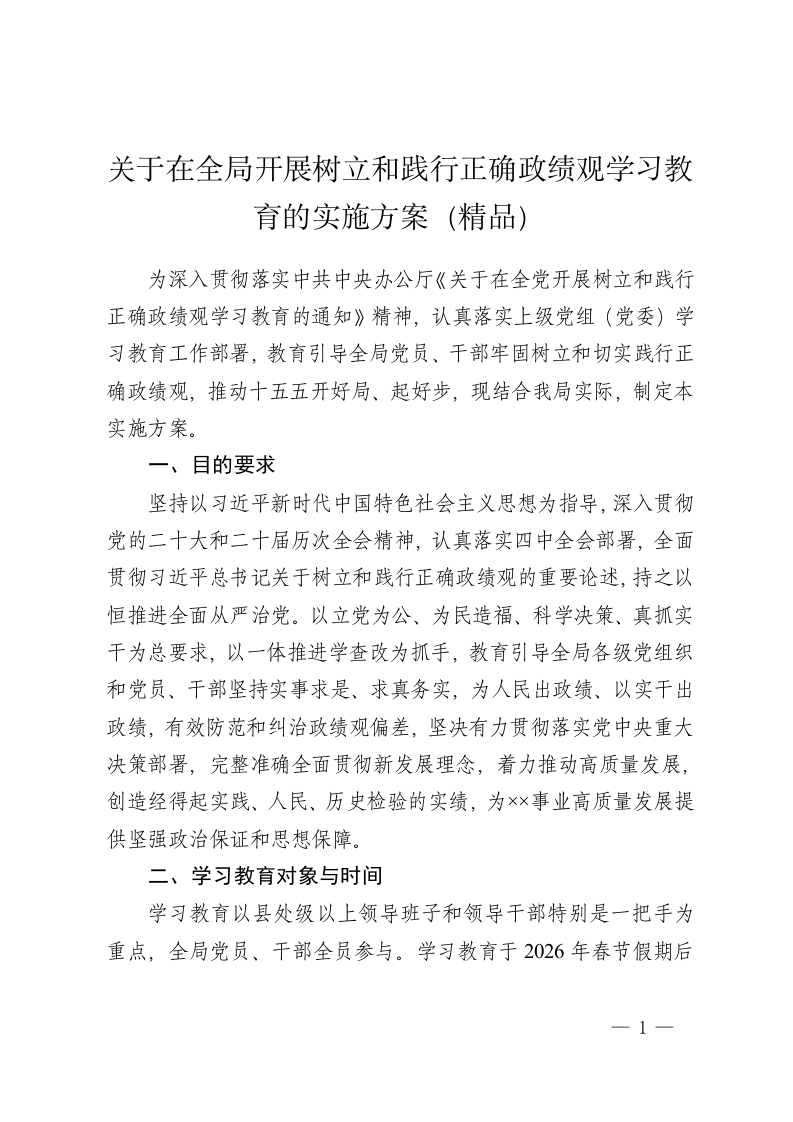 关于在全局开展树立和践行正确政绩观学习教育的实施方案(精品)