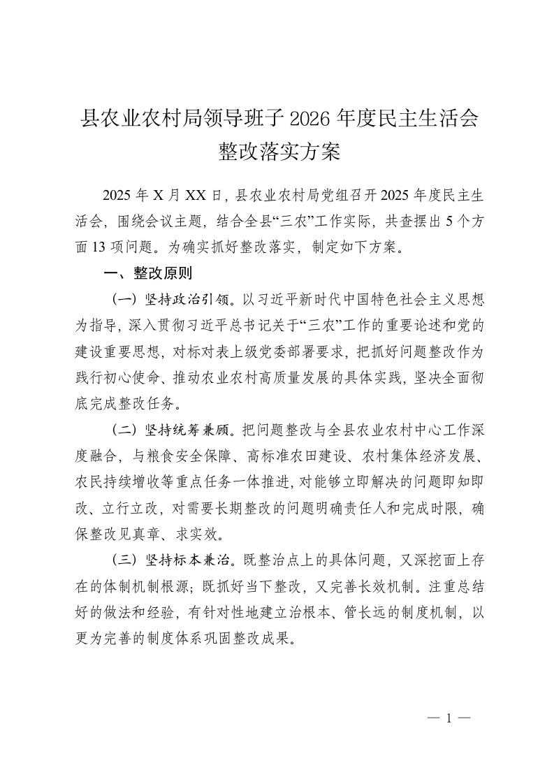 县农业农村局领导班子2026年度民主生活会整改落实方案
