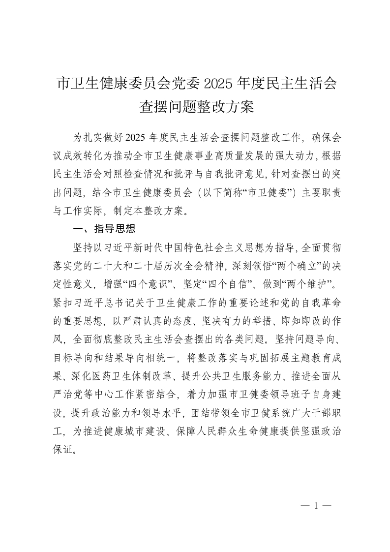 市卫生健康委员会党委2025年度民主生活会查摆问题整改方案