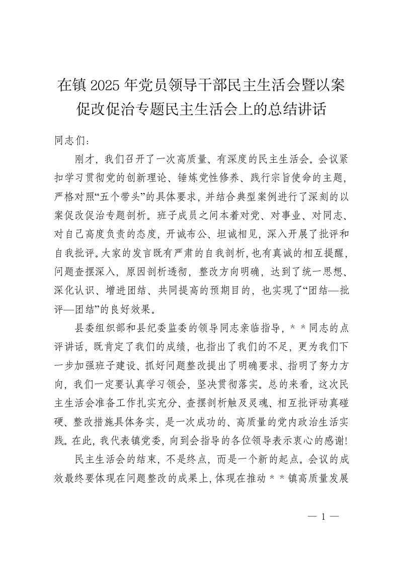在镇2025年党员领导干部民主生活会暨以案促改促治专题民主生活会上的总结讲话