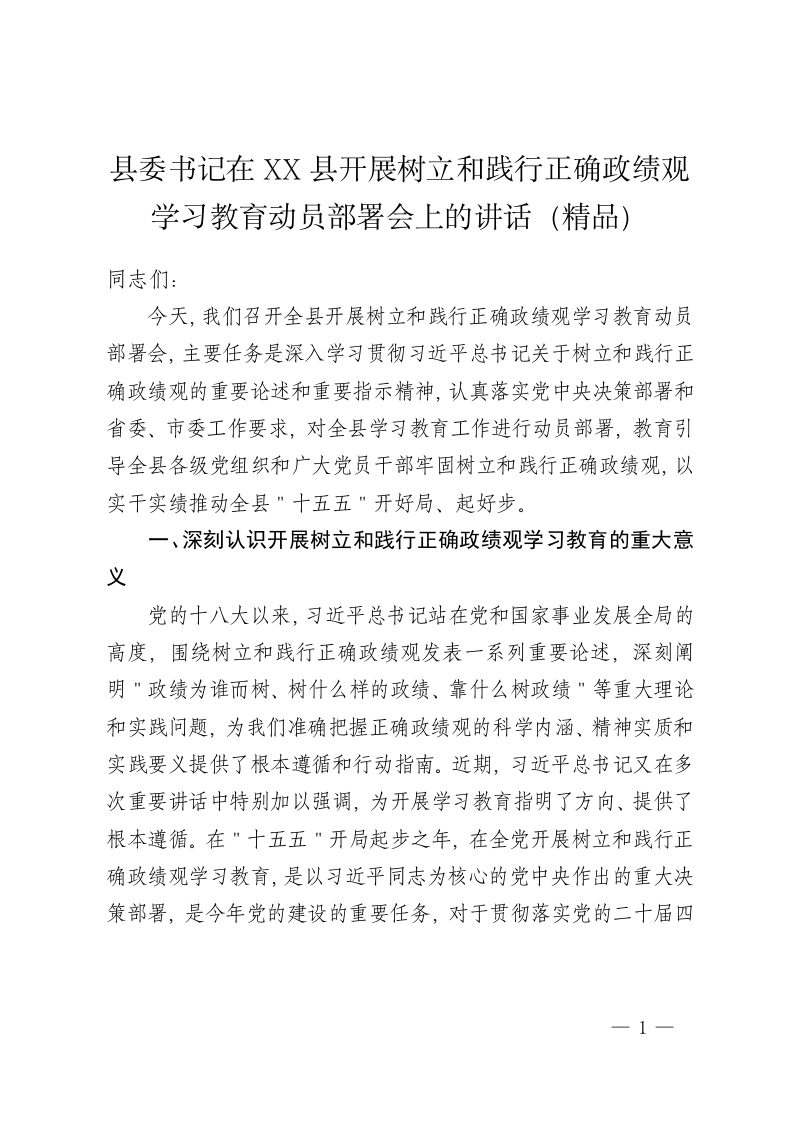 县委书记在XX县开展树立和践行正确政绩观学习教育动员部署会上的讲话(精品)同志们:今天,我们召开全县开展树立和践行正确政绩观学习教育动员部署会,主要任务是深入学习贯彻习近平总书记关于树立和践行正确政绩观的重要论述和重要指示精神,认真落实党中央决策部署和省委、市委工作要求,对全县学习教育工作进行动员部署,教育引导全县各级党组织和广大党员干部牢固树立和践行正确政绩观,以实干实绩推动全县”十五五”开好局、起好步。一、深刻认识开展树立和践行正确政绩观学习教育的重大意义党的十八大以来,习近平总书记站在党和国家事业发展全局的高度,围绕树立和践行正确政绩观发表一系列重要论述,深刻阐明”政绩为谁而树、树什么样的政绩、靠什么树政绩”等重大理论和实践问题,为我们准确把握正确政绩观的科学内涵、精神实质和实践要义提供了根本遵循和行动指南。近期,习近平总书记又在多次重要讲话中特别加以强调,为开展学习教育指明了方向、提供了根本遵循。在”十五五”开局起步之年,在全党开展树立和践行正确政绩观学习教育,是以习近平同志为核心的党中央作出的重大决策部署,是今年党的建设的重要任务,对于贯彻落实党的二十届四1中全会战略部署,夯实党的执政根基,持之以恒推进全面从严治党,奋力开创中国式现代化建设新局面,具有重大而深远的意义。(一)从坚定拥护”两个确立”、坚决做到”两个维护”的高度来看,开展学习教育是贯彻落实党的二十届四中全会战略部署、确保基本实现社会主义现代化取得决定性进展的必然要求。党的二十届四中全会对推进中国式现代化建设作出全面部署,这些战略部署的落地见效,必须依靠各级干部树立和践行正确政绩观,以实干担当推动各项事业高质量发展。只有树立正确政绩观,才能确保党中央决策部署在基层落地生根、开花结果,才能以实际行动诠释对党的绝对忠诚。(二)从践行党的根本宗旨、夯实党的执政根基的高度来看,开展学习教育是始终站稳人民立场、一心为民造福的重要举措。江山就是人民,人民就是江山。我们党之所以能够历经百年风雨而不衰,根本原因就在于始终把人民放在心中最高位置。政绩观反映着干部的党性修养、政治立场和格局境界,检验着干部是否真正把人民放在心中最高位置。只有牢固树立为民造福的政绩观,才能始终把人民群众的利益放在首位,才能真正做到想群众之所想、急群众之所急、解群众之所困,才能不断夯实党的执政根基。(三)从巩固拓展党内集中学习教育成果、持之以恒推进全面从严治党的角度来看,开展学习教育是加强干部队伍建设的有效途径。近年来,通过深入开展党内集中学习教育,全县干部队伍思想作风持续好转。但也要清醒看到,一些干部在政绩观方面仍存在突2出问题,有的片面追求”显绩”,忽视打基础、利长远的”潜绩”;有的急功近利、急于求成,搞”形象工程”"面子工程”;有的缺乏担当、懈怠躺平,存在”新官不理旧账”现象;有的宗旨意识不牢,脱离群众、漠视民生。这些问题不解决,就会严重损害党和政府形象,严重影响高质量发展进程。当前,XX正处于转型发展的关键时期。”十四五”期间,全县实现了从”贫困落后”到”全面小康”的历史性跨越,经济社会发展取得了显著成效。2025年,全县经济稳中向好,民生福祉持续提升。2026年是”十五五"规划的开局之年,全县经济社会发展主要预期目标是地区生产总值增长5%左右,一般公共预算收入增长2.5%。在这一关键节点开展学习教育,充分释放出以实干实绩促进事业发展的鲜明信号,对于凝聚全县上下干事创业的强大合力、推动XX高质量发展具有特殊重要的意义。全县各级党组织和广大党员干部要站在政治和全局的高度,认真学习领会习近平总书记重要讲话和重要指示精神,深刻认识开展学习教育的重大意义,自觉把思想和行动统一到党中央决策部署和省委、市委工作要求上来,以高度政治自觉把学习教育组织好、开展好、实施好,更加深刻领悟"两个确立"的决定性意义,坚决做到”两个维护”,确保学习教育取得实实在在的成效。二、准确把握树立和践行正确政绩观学习教育的目标要求这次学习教育,党中央明确提出了”立党为公、为民造福、科学决策、真抓实干”的总要求,这四个方面相互联系、有机统一,