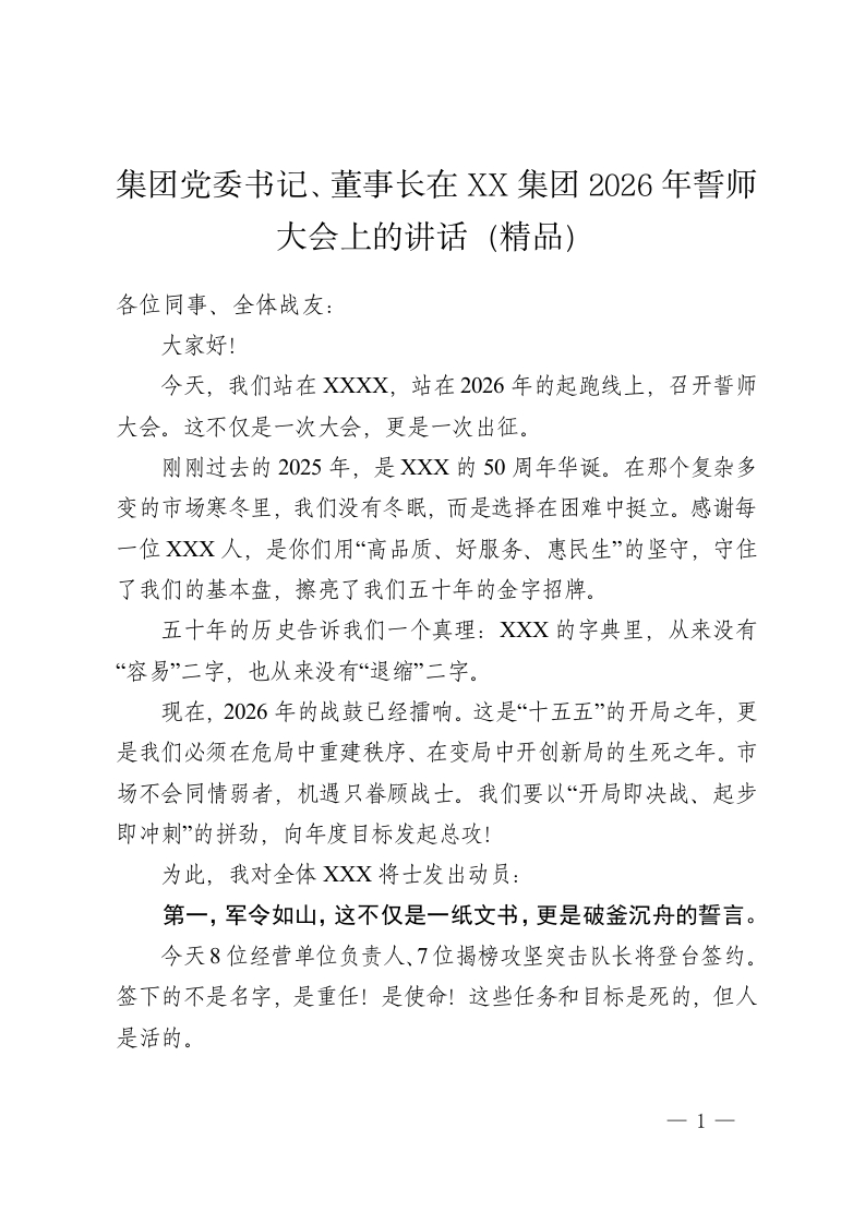 集团党委书记、董事长在XX集团2026年誓师大会上的讲话(精品)各位同事、全体战友:大家好!今天,我们站在XXXX,站在2026年的起跑线上,召开誓师大会。这不仅是一次大会,更是一次出征。刚刚过去的2025年,是XXX的50周年华诞。在那个复杂多变的市场寒冬里,我们没有冬眠,而是选择在困难中挺立。感谢每一位XXX人,是你们用“高品质、好服务、惠民生”的坚守,守住了我们的基本盘,擦亮了我们五十年的金字招牌。五十年的历史告诉我们一个真理:XXX的字典里,从来没有“容易”二字,也从来没有“退缩”二字。现在,2026年的战鼓已经擂响。这是“十五五”的开局之年,更是我们必须在危局中重建秩序、在变局中开创新局的生死之年。市场不会同情弱者,机遇只眷顾战士。我们要以“开局即决战、起步即冲刺”的拼劲,向年度目标发起总攻!为此,我对全体XXX将士发出动员:第一,军令如山,这不仅是一纸文书,更是破釜沉舟的誓言。今天8位经营单位负责人、7位揭榜攻坚突击队长将登台签约。签下的不是名字,是重任!是使命!这些任务和目标是死的,但人是活的。1什么是军令?签下去,就是“黄沙百战穿金甲,不破楼兰终不还”的决心。我们要把指标拆解到每个月、每一天,把责任压实到每一个岗位、每一个人。在XXX,没有旁观者,只有答卷人。完不成任务就是失职,达不成目标就必须担责!我们要让每一个人都明白:混日子的人,在XXX没有立足之地。第二,挂图作战,不仅要有决心,更要有打胜仗的章法。勇气是刀刃,策略是刀锋。面对艰巨任务,光喊口号不行,必须谋定而后动。各战队要迅速拿出“作战地图”,围绕“深化转型、创新突破、提质增效”这十二字方针,把工作清单化、节点化、数据化。我们要像外科手术一样精准发力,哪里是痛点就打通哪里,哪里是增长点就扑向哪里。我们要定期“晾晒成绩单”,让进度上墙,让数据说话。只看结果,不要借口;只要真金白银的回报,不要纸上谈兵的花架子。第三,赏罚分明,绝不让奋斗者吃亏,绝不让“躺平”者混日子。集团将全程跟踪、严格考核。张总裁提出的“标准要高、行动要快、方法要活、作风要实”,就是我们行动的铁律。在这里我重申集团的用人导向:谁能干成事,谁就是英雄;谁在冲锋,资源就向谁倾斜。对于超额完成任务、表现卓越的团队,我们要让他们在物质上丰收、精神上光荣、平台上晋升。奖金要发得让人眼红,晋升要快得让人心动。但对于那些畏缩不前、推诿扯皮,甚至“躺平”2的人,对不起,军令状不是儿戏。问责不是目的,但一定是手段。我们要让奋斗者满载而归,让慵懒者无地自容。第四,使命在肩,不仅要低头拉车,更要抬头看路。我们身处一个伟大的时代,人工智能呼啸而来,新质生产力重塑格局。如果我们还用旧地图寻找新大陆,注定会迷航。集团将加快建立学习型组织,我们要主动拥抱AL,拥抱变革,让学习力迅速转化为战斗力。我们要把“文化+培训”打造成未来的新增长曲线,为百年XXX开辟一条新赛道。兄弟们,记住:只有不断进化的物种,才能在寒冬中生存。全体战友们!战鼓已经擂起,号角已经吹响。面对2026,我们不要做等待者,要做创造者;不要做观望者,要做冲锋者。拿出我们“闯”的魄力,打破常规;拿出我们“抢”的意识,分秒必争;拿出我们“拼”的勇气,向死而生!把我们的精气神融入血脉,把我们的责任扛在肩上。我相信,只要我们拧成一股绳,就没有过不去的火焰山,没有攻不下的堡垒!让我们擂响战鼓,扛起责任,向着胜利一一前进!前进!前进!