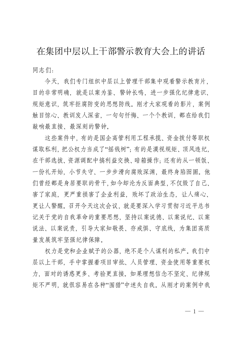 在集团中层以上干部警示教育大会上的讲话同志们:今天,我们专门组织中层以上管理干部集中观看警示教育片,目的非常明确,就是以案为鉴、警钟长鸣,进一步强化纪律意识、规矩意识,筑牢拒腐防变的思想防线。刚才大家观看的影片,案例触目惊心、教训发人深省,一句句忏悔、一个个教训,都在给我们敲响最直接、最深刻的警钟。这些案件中,有的是国企高管利用工程承揽、资金拨付等职权谋取私利,把公权力当成了“摇钱树”;有的是漠视规矩、顶风违纪,在干部选拔、资源调配中搞利益交换、暗箱操作;还有的从一顿饭、一份礼开始,小节失守、一步步滑向腐败深渊,最终身陷图圖。他们曾经都是身居要职的骨干,如今却沦为反面典型,不仅毁了自己、害了家庭,更严重损害了企业利益,败坏了政治生态,让人痛心、更让人警醒。召开今天这次会议,就是要深入学习贯彻习近平总书记关于党的自我革命的重要思想,坚持以案说德、以案说纪、以案说法、以案说责,引导大家知敬畏、存戒惧、守底线,为集团高质量发展筑牢坚强纪律保障。权力是党和企业赋予的公器,绝不是个人谋利的私产。我们中层以上干部,手中掌握着项目审批、人员管理、资金使用等重要权力,面对的诱惑更多、考验更直接。如果理想信念不坚定、纪律规矩不严明,就很容易在各种“围猎”中迷失自我。从刚才的案例中我们可以清晰看到,破法无不始于破纪,有的把项目分包权当成“提款机”,让制度程序形同虚设;有的违规吃喝、收受礼品礼金,认为是小事小节;还有的奉行好人主义,不敢管、不愿管,最终导致小问题演变成大错误。这些教训深刻警示我们,侥幸是最大的危险,麻痹是最大的隐患,一旦触碰纪法红线,无论职务多高、贡献多大,终将受到严肃查处、付出沉重代价。在看到教训的同时,我们也要清醒认识到,集团党风廉政建设还存在一些薄弱环节。少数干部政治站位不高,对中央八项规定精神认识不到位,觉得吃点喝点、拿点收点不算什么;有的干部纪律意识淡薄,在工程招标、物资采购等关键环节不按制度办事;还有的干部履行“一岗双责”不到位,对分管领域党风廉政建设抓得不紧、管得不严。这些问题看似不大,但如果不及时纠正、不彻底整改,就会埋下腐败的种子,最终影响企业发展大局。全体中层以上干部,必须以此次警示教育为契机,反躬自省、警钟长鸣,真正从思想深处拧紧螺丝。借此机会,我对全体中层以上干部提四点要求:第一,筑牢思想防线,永葆忠诚本色。要持续深入学习习近平总书记关于党的作风建设、纪律建设的重要论述,把中央八项规定及其实施细则精神学深悟透、落到实处,不断提高政治判断力、政治领悟力、政治执行力。要坚定理想信念,勤修为政之德,常思贪欲之害,自觉用党的创新理论武装头脑,用廉洁文化涵养清风正气,始终做到忠诚于党、忠诚于企业、忠诚于职工群众,从思想根源上筑牢拒腐防变的堤坝。第二,严守纪律底线,规范用权履职。纪律规矩是带电的“高压线”,绝不能触碰、绝不能逾越。大家要时刻绷紧纪律这根弦,严格遵守党的政治纪律、组织纪律、廉洁纪律、群众纪律、工作纪律、生活纪律,在工程招标、资金拨付、干部任用等关键环节,坚决按制度办事、按程序操作,不搞变通、不打折扣、不越雷池。要自觉净化社交圈、生活圈、朋友圈,管好自己、管好家人、管好身边人,坚决抵制各种歪风邪气,做到公正用权、依法用权、廉洁用权。第三,压实主体责任,强化严管厚爱。作为管理干部,既要抓好业务,更要抓好党风廉政建设,必须切实履行好“一岗双责”。要敢抓敢管、严抓严管,对苗头性、倾向性问题早发现、早提醒、早纠正,真正做到抓早抓小、防微杜渐。同时,要坚持严管和厚爱结合、激励和约束并重,对违纪违法行为零容忍,对敢于担当、踏实做事的干部撑腰鼓劲,营造既守纪律、又敢担当的良好干事氛围。第四,坚持风腐同查,深化以案促改。要深刻认识风腐同源、风腐一体的规律,既要严肃查处腐败问题,也要深挖背后的作风隐患,坚决斩断由风及腐、风腐勾连的链条。要对照警示教育片里的典型案例,结合自身岗位职责,深入开展自查自纠,建立问题清单、责任清单、整改清单,做到即知即改、立行立改。要不断健全监督