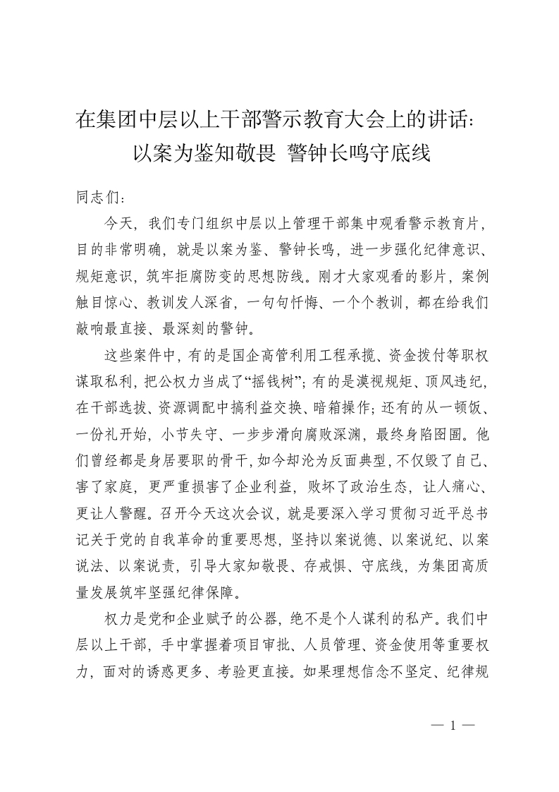在集团中层以上干部警示教育大会上的讲话:以案为鉴知敬畏 警钟长鸣守底线