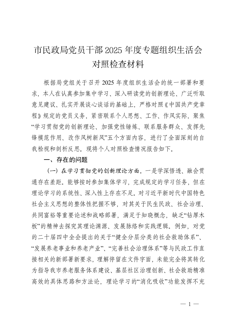 市民政局党员干部2025年度专题组织生活会对照检查材料