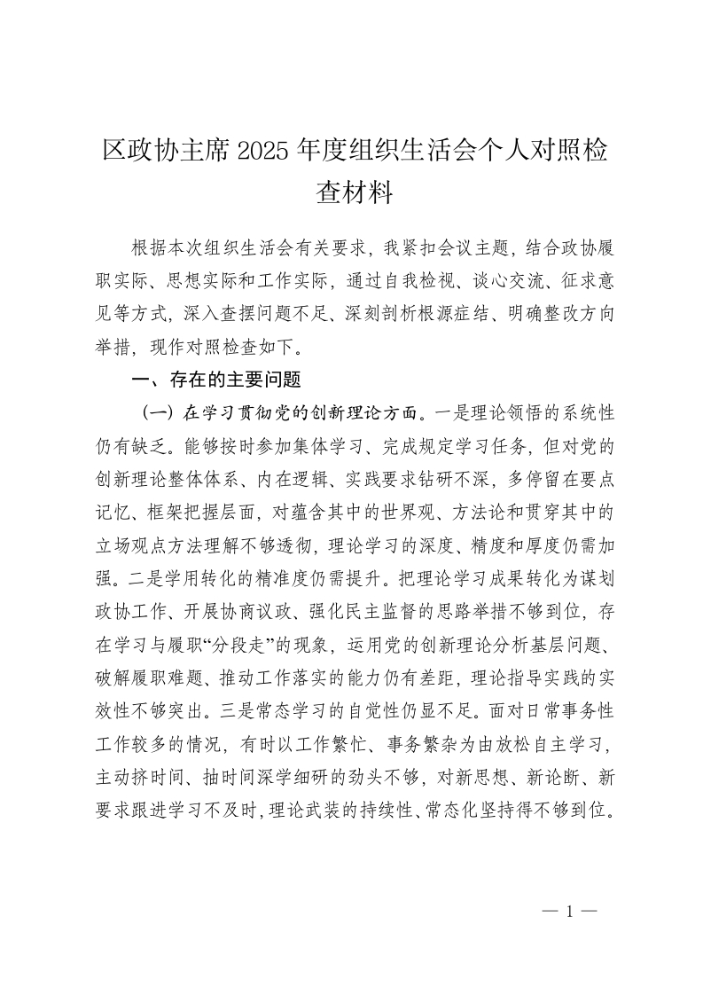 区政协主席2025年度组织生活会个人对照检查材料