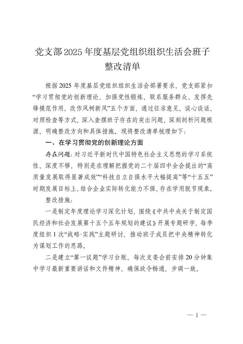 党支部2025年度基层党组织组织生活会班子整改清单