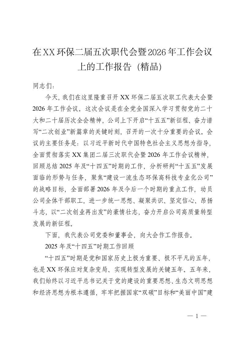 在XX环保二届五次职代会暨2026年工作会议上的工作报告(精品)