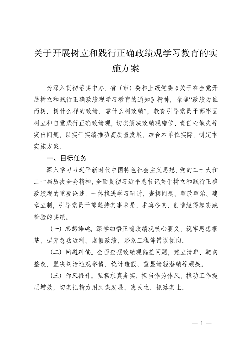 关于开展树立和践行正确政绩观学习教育的实施方案