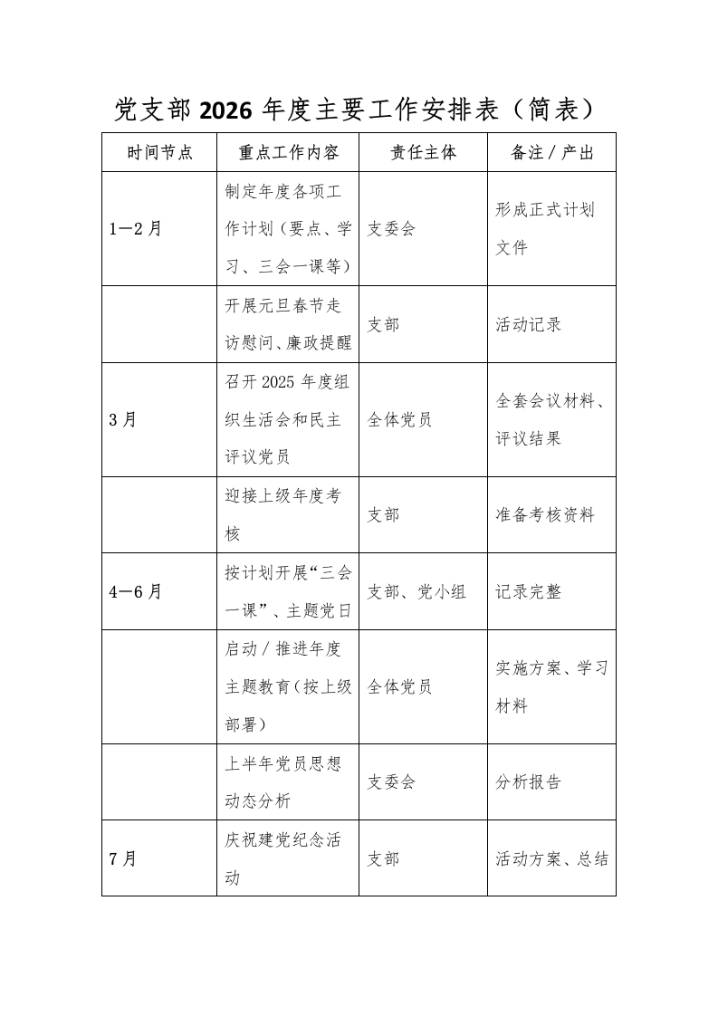 首页公文大全计划方案党支部2026年度主要工作安排表(简表)