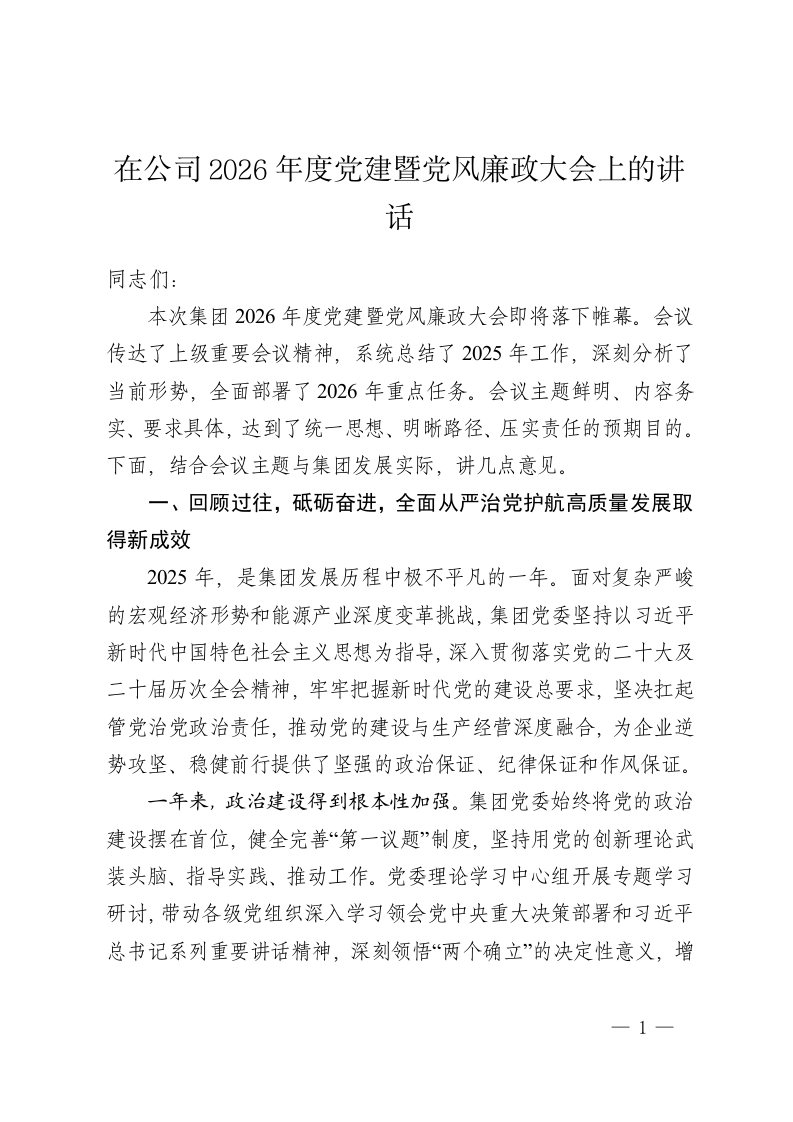 首页百家争鸣企业在公司2026年度党建暨党风廉政大会上的讲话