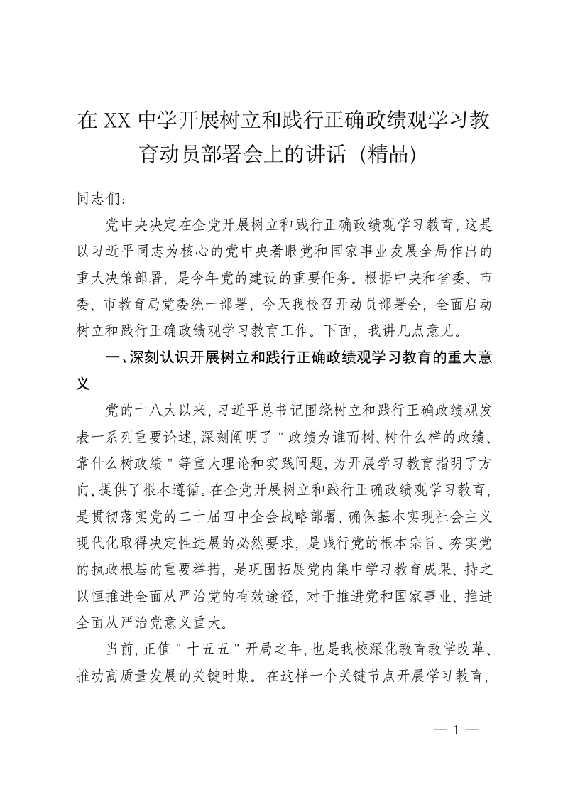 在XX中学开展树立和践行正确政绩观学习教育动员部署会上的讲话(精品)