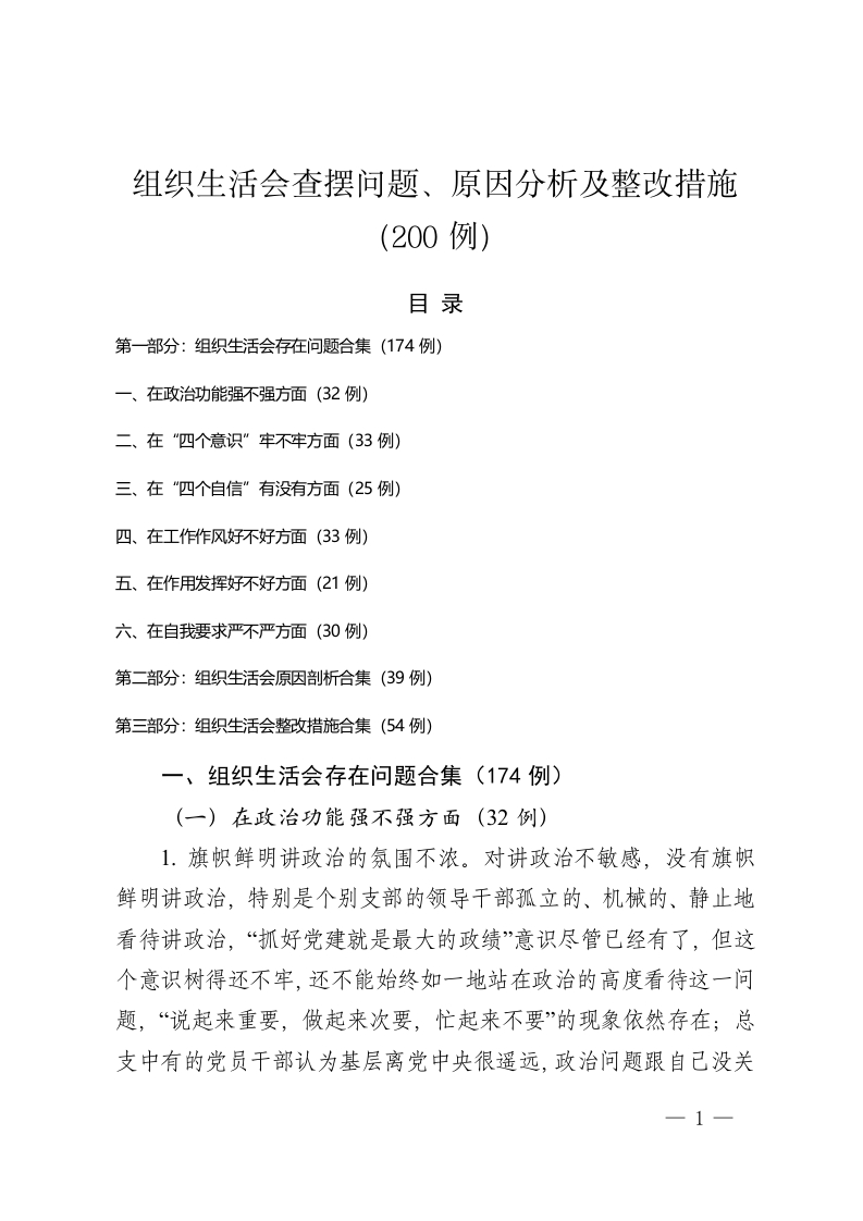 组织生活会查摆问题、原因分析及整改措施(200例)