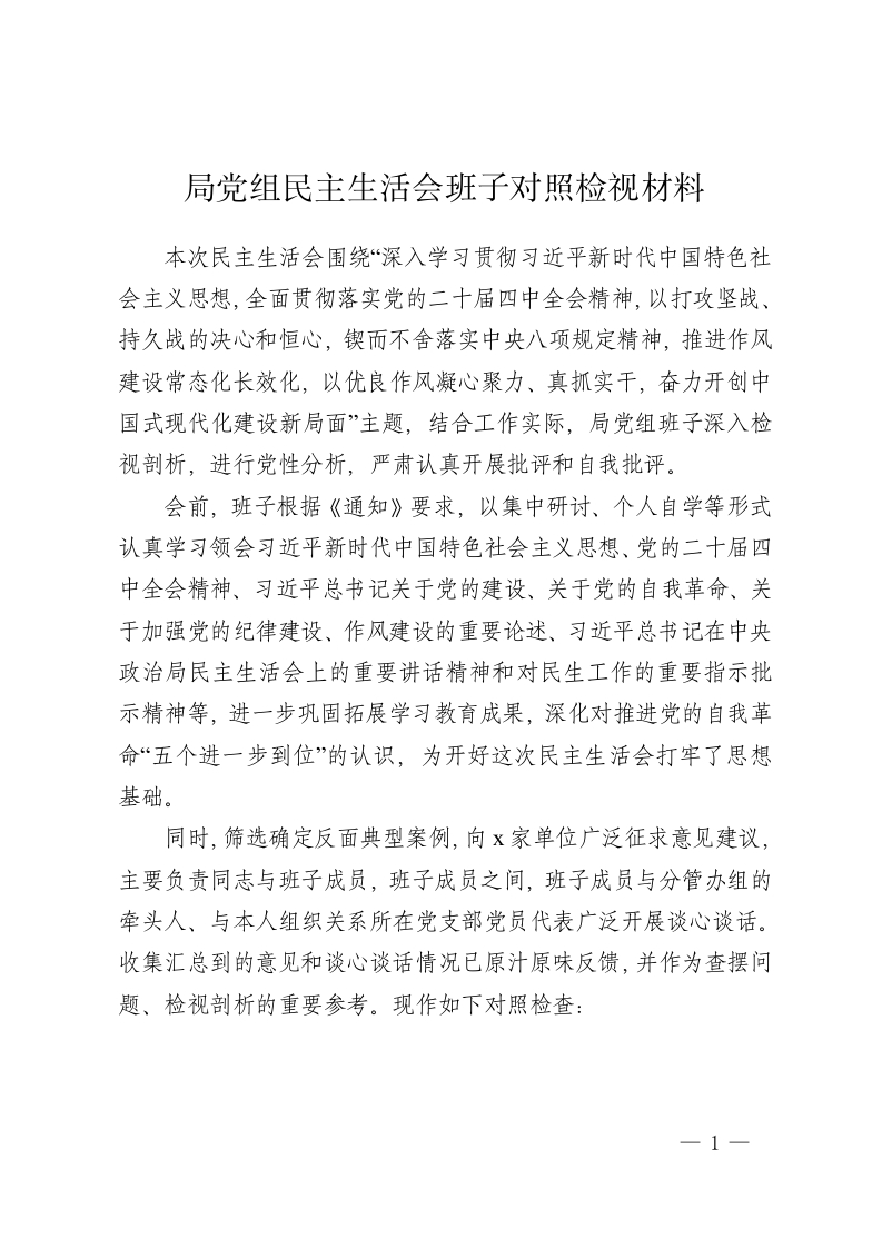 局党组民主生活会班子对照检视材料